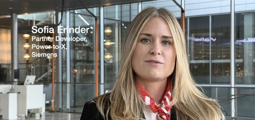 Sofia Erinder arbetar som Partner Developer inom Power-to-X på Siemens, där hon ansvarar för företagets vätgasportfölj i Sverige och samarbetar med vätgaskunder. Hennes arbete handlar om att utveckla teknologilösningar inom digitalisering, elektrifiering och processautomation – nyckelområden för den gröna omställningen.